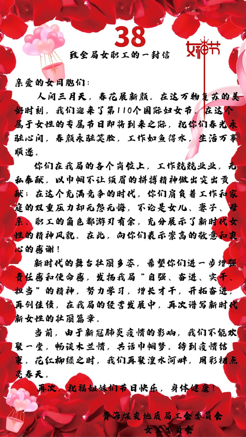 第110个国际妇女因新冠肺炎疫情而变得特殊难忘,因非常时期,不宜举办聚集性活动,局工会创新活动方式,通过征集“弘扬时代新风,展示巾帼风采”微视频、《致全局女职工的一封信》、局机关女职工“书香工会”第一期读书分享会的方式,为女职工送上节日的祝福,与女职工欢度佳节。