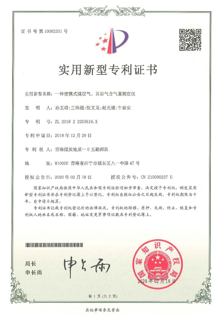 日前,青海煤炭质一0五勘探队新获得国家知识产权局颁发的“一种便携式煤层气、页岩气含气量测定仪”等实用新型专利证书6个。近三年多来,一0五勘探队共申报专利29项,累计取得专利证书14个。