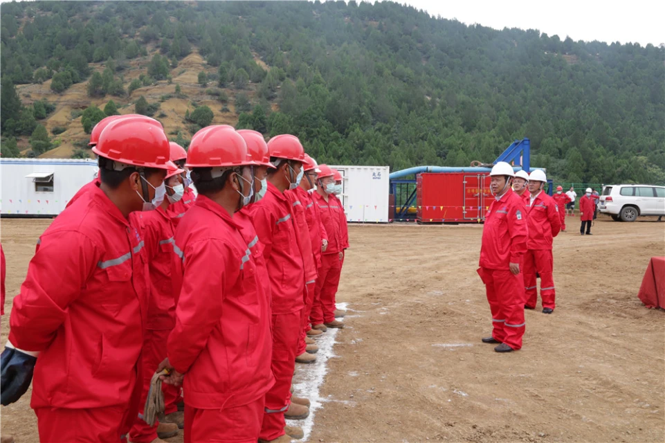 开工仪式由一0五队党委书记张少林主持,一0五队深部钻井公司总经理苏延鹤介绍了项目情况和开工前的各项准备工作,河南省资源环境调查二院院长罗锐对项目顺利开工表示祝贺,他表示将继续与一0五队加强全面合作,给予大力支持,同是地质人,共创新精彩。一0五队代理队长张文龙在开工仪式上作表态发言,项目组全体职工将始终坚持安全生产理念,充分发挥石油ZJ40钻机的设备优势,集中优势力量确保项目顺利完成,不断提高技术水平,保证施工质量,展现高原铁军风采,不辜负上级领导的殷切希望。王明宏副局长在致辞中指出,一0五队多年来深耕地勘市场,有良好的信誉和口碑,今天在沁水盆地潘庄开工标志着一0五队在地勘能力建设、钻探技术、市场开拓方面上了新台阶。他要求全体机组人员要将安全管理和质量管控贯穿在项目施工的全过程,切实做到安全生产、绿色勘查、质量为上。张强骅局长向项目组提出殷切希望,希望一0五队要继续发扬高原铁军精神和五个特别精神,发挥联合党支部的战斗堡垒作用,以党建促生产、以党建促安全,使青海地勘旗帜在工地上空高高飘扬。