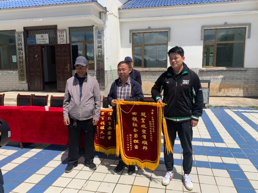2021年5月19日。在碱沟村党员活动室前的广场上,全体脱贫户来到广场上,脱贫户特别为2015年与碱沟村开展结对帮扶的青海煤炭地质局(公司)送上了一幅“扶贫济困送温暖,真情扶贫爱百姓”的牌匾,真心体现了全体脱贫户对青海煤炭地质局的干部职工五年来结对帮扶的由衷感谢。为东川镇党委、政府赠送了一面锦旗,锦旗上的“精准帮扶暖人心,脱贫思源铭党恩”充分表达了全体脱贫户感谢共产党,感谢政府为贫困群体制定的好政策的感激之情。脱贫户还向五年来驻守在村里的扶贫工作队赠送了书写着“脱贫攻坚有顺邦,回报社会勇担当”的锦旗,为碱沟村两委赠送了“精准扶贫办实事,心系百姓暖人心”的锦旗。