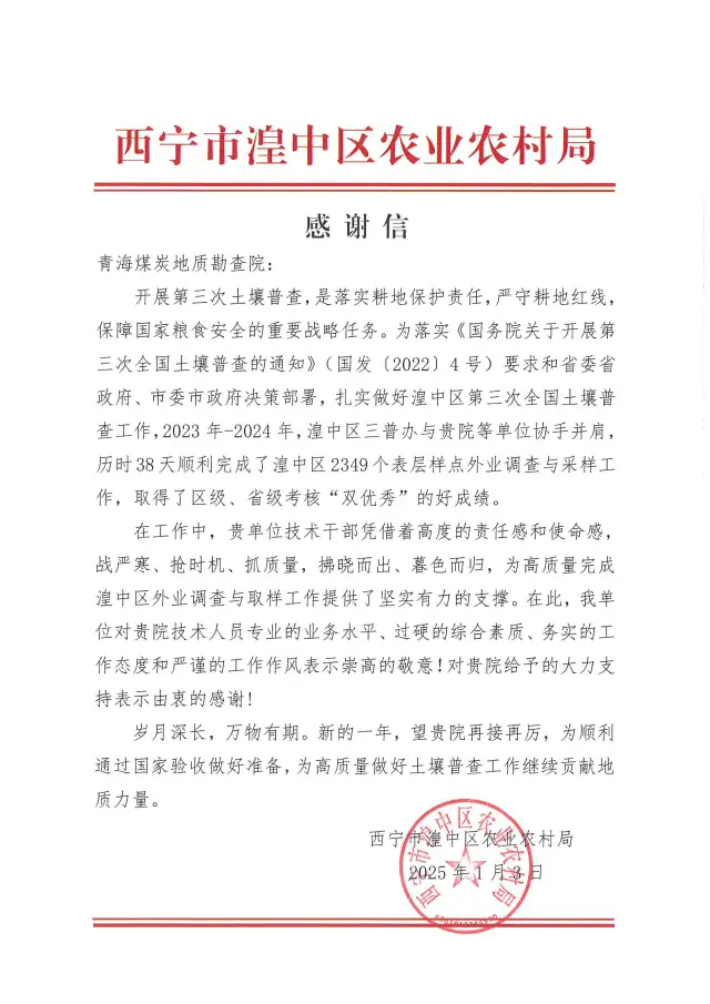 近日,西宁市湟中区农业农村局向煤勘院发来感谢信,对煤勘院在第三次全国土壤普查工作中展现出的精湛的专业水平、过硬的综合素质、务实负责的工作态度和严谨的工作作风给予了高度的肯定并表示诚挚感谢。