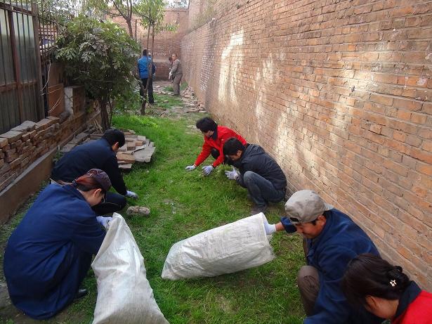 砖厂路13号院是中心古城台基地所属家属院,院内共有10个单元,100户住户,2013年10月,基地中心根据西宁市既有住房节能改造的相关政策,通过资料整理、住户意见调查、费用核算等相关工作向西宁市节能改造办公室提交改造申请,2014年9月底得到批复并立项进行施工,此家属区经过节能改造后,小区环境焕然一新,但美中不足的是住宅楼后杂草丛生,垃圾依然存在,面对这种情况,中心领导班子提前做好规划,在节约开支的前提下,充分利用西关大街42号家属院内已拆煤房的废砖进行人工地面铺砖借以改变这种状况。