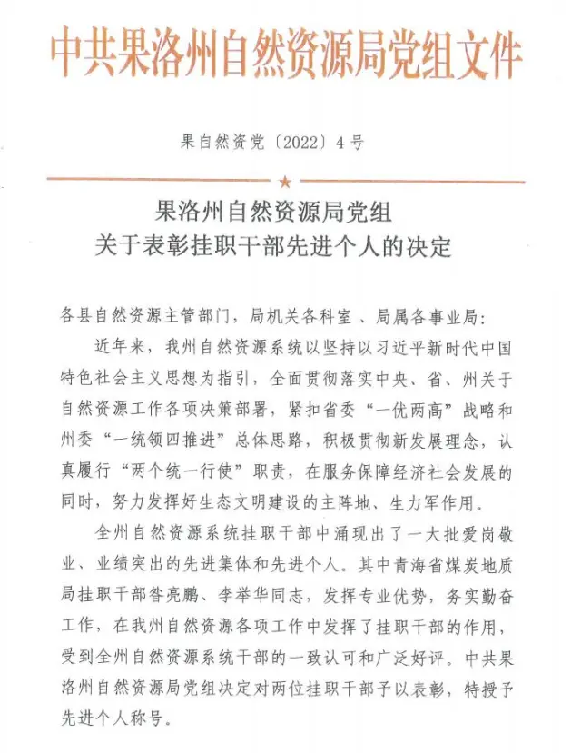 表彰决定中指出,青海煤炭地质局挂职干部昝亮鹏、李举华同志,发挥专业优势,务实勤奋工作,在果洛州自然资源各项工作中发挥了挂职干部的作用,受到全州自然资源系统干部的一致认可和广泛好评。
