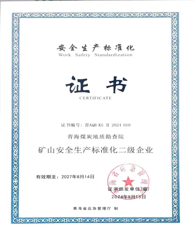 近日,煤勘院通过安全生产标准化企业认证,取得矿山安全生产标准化二级企业证书,企业安全生产管理体系规范化、科学化、标准化水平提质升级。