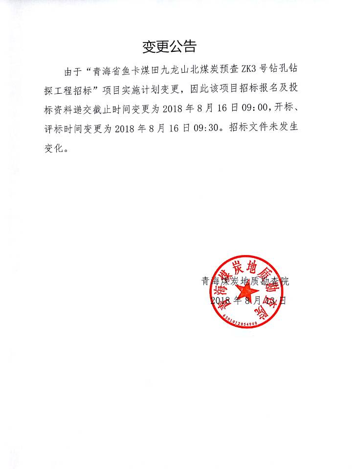 青海煤炭地质勘查院《青海省鱼卡煤田九龙山北煤炭预查》项目ZK3号钻孔变更公告