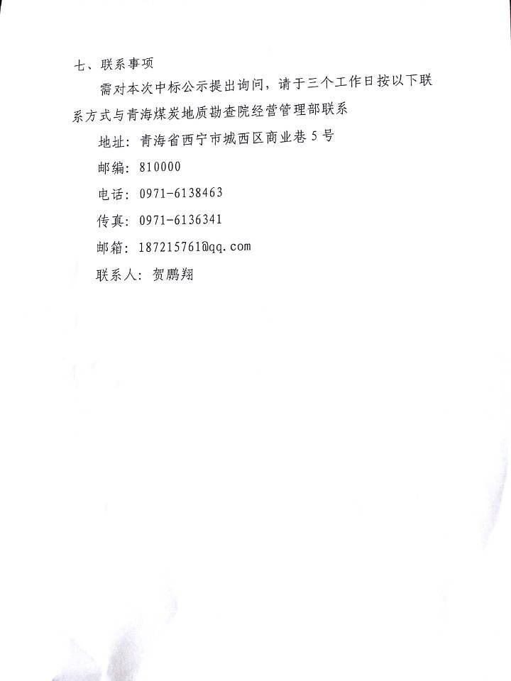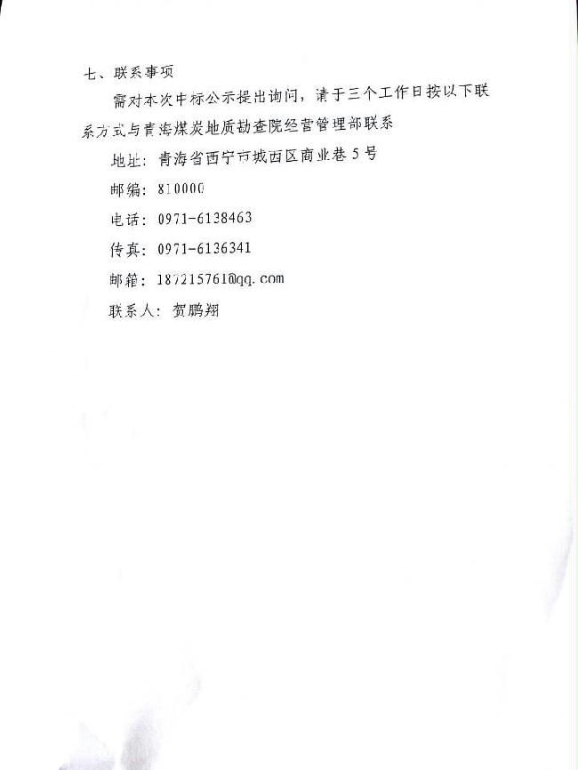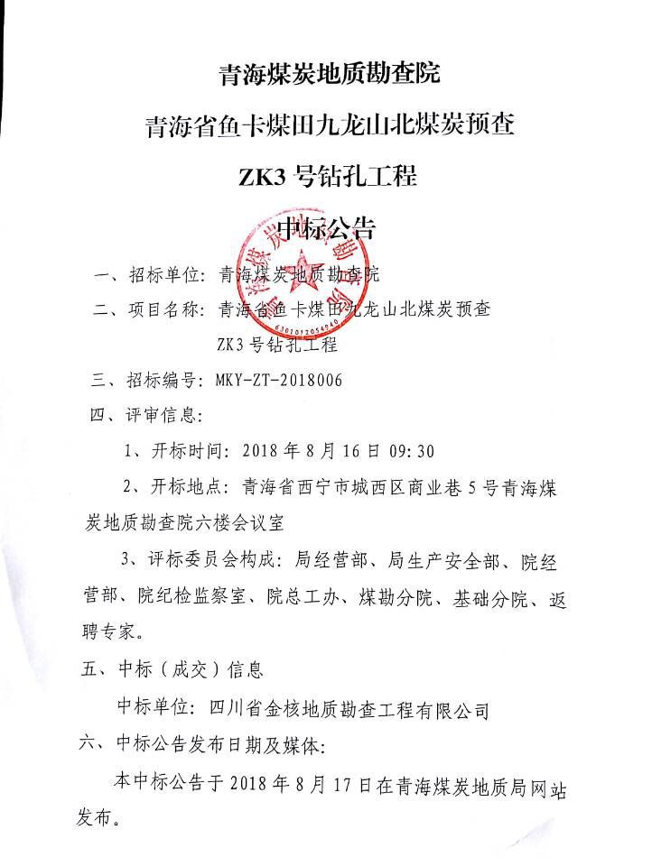 青海煤炭地质勘查院《青海省鱼卡煤田九龙山北煤炭预查》项目ZK3号钻孔中标公告