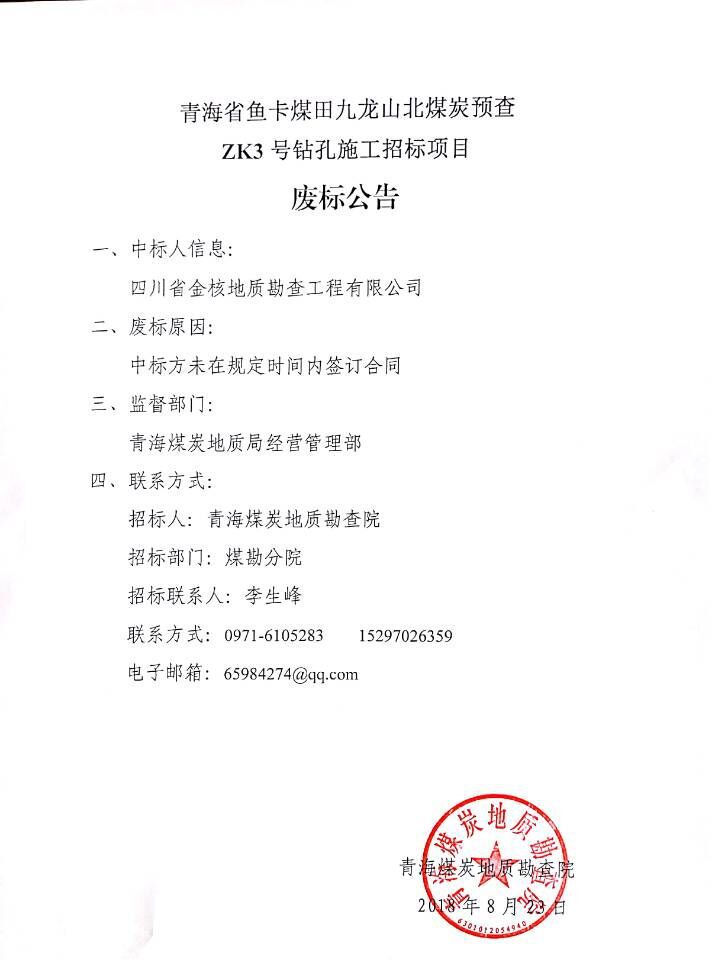 青海煤炭地质勘查院《青海省鱼卡煤田九龙山北煤炭预查》项目ZK3号钻孔废标公告