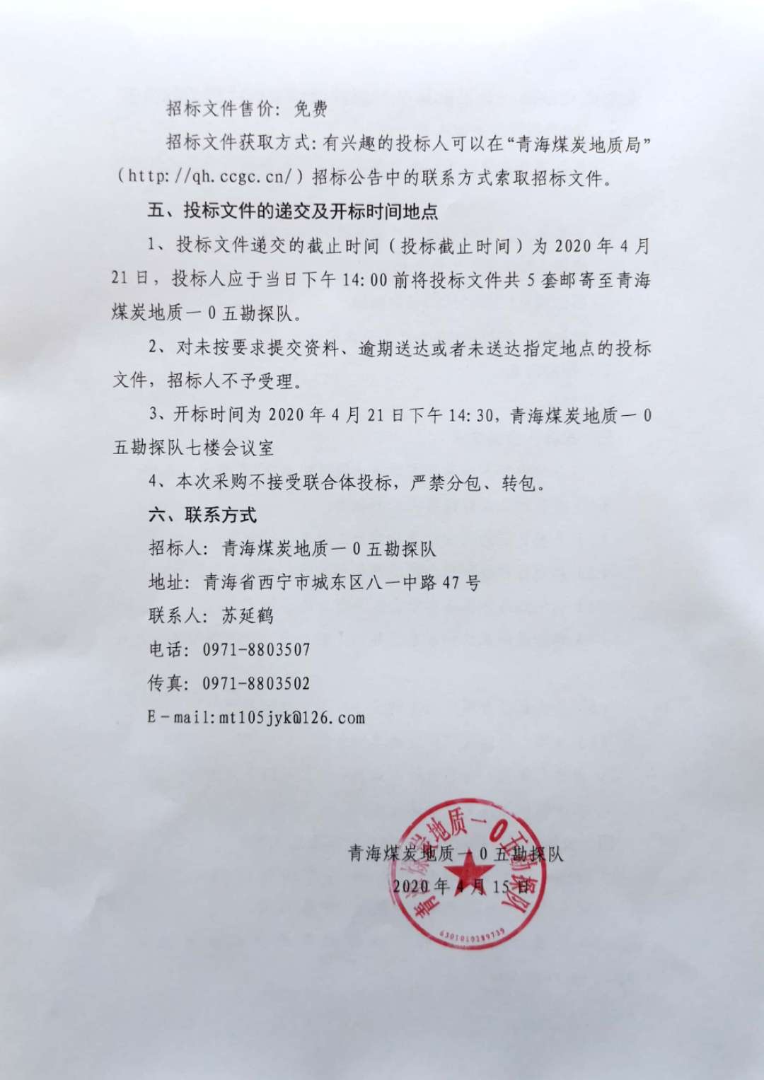 青海煤炭地质一0五勘探队煤层气分析、化验、测试项目招标公告