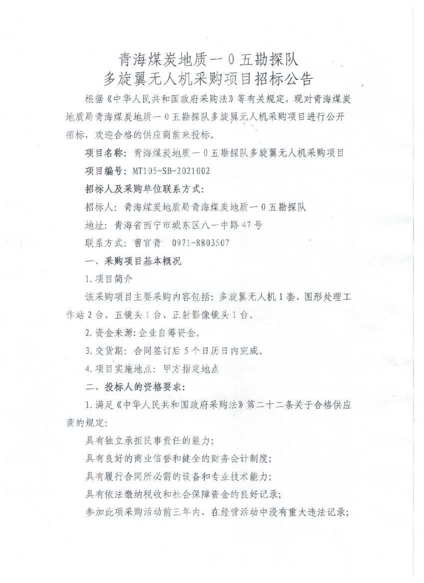 青海煤炭地质一0五勘探队多旋翼无人机采购项目招标公告