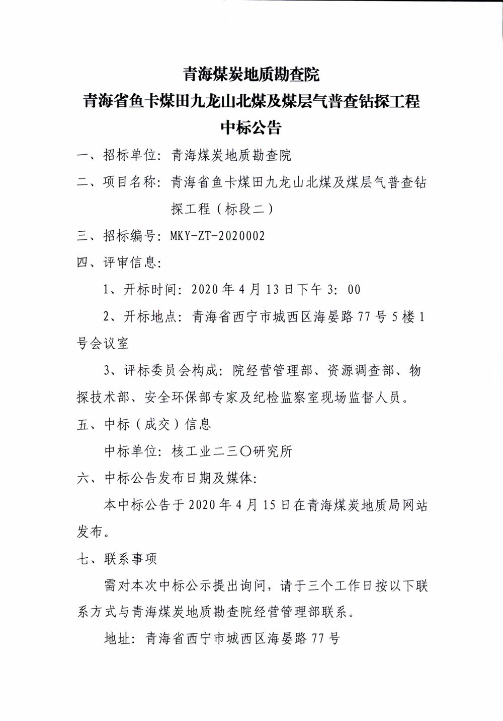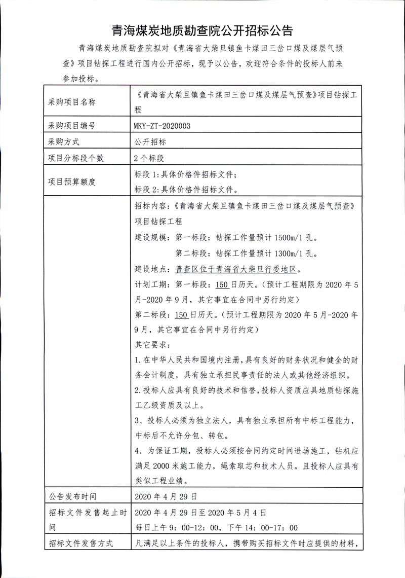 青海煤炭地质勘查院《青海省鱼卡煤田九龙山北煤及煤层气普查钻探工程》中标公告