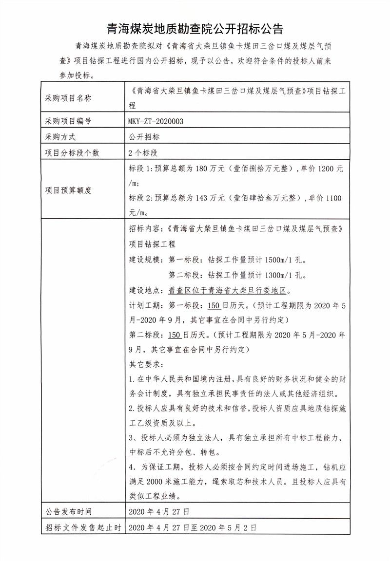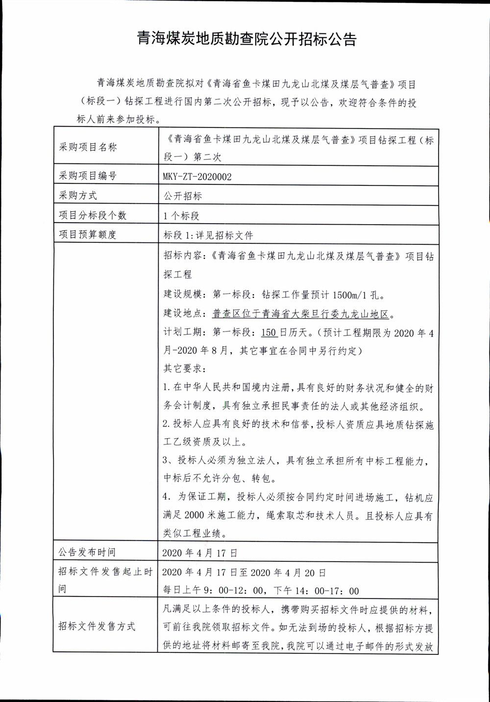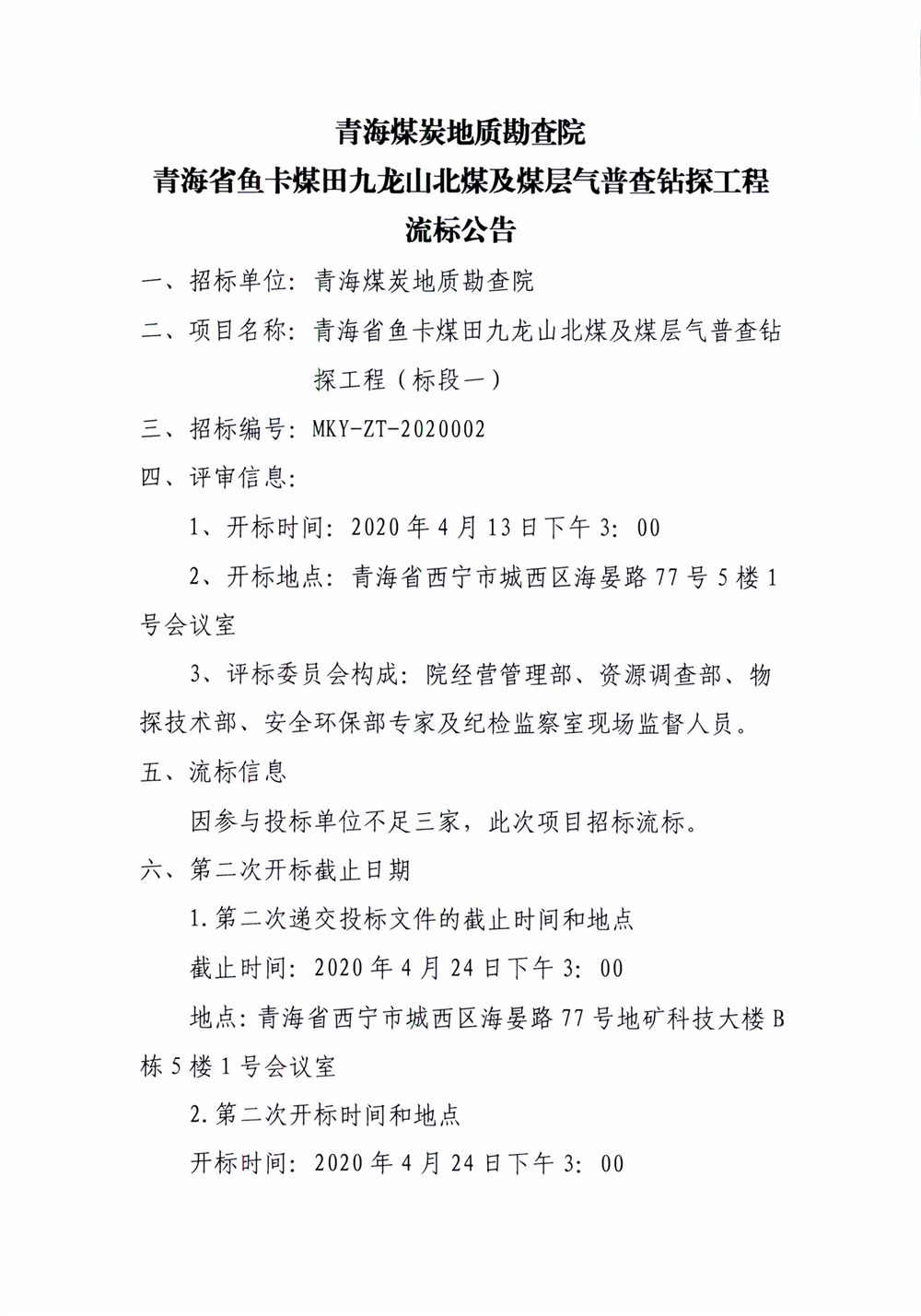 青海煤炭地质勘查院《青海省鱼卡煤田九龙山北煤及煤层气普查钻探工程》流标公告