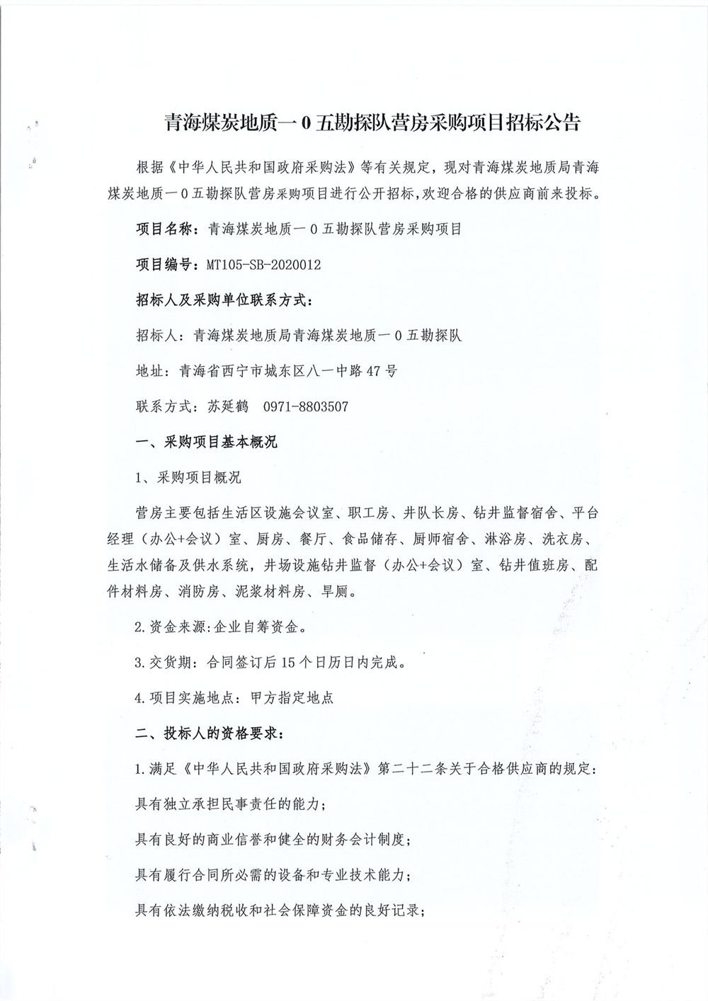 青海煤炭地质一0五勘探队营房采购项目招标公告