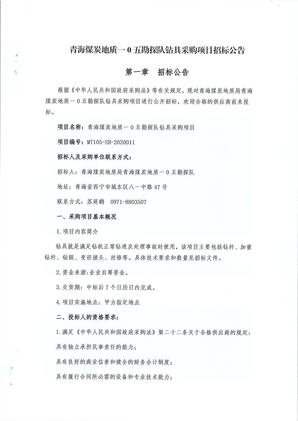 青海煤炭地质一0五勘探队钻具采购项目招标公告