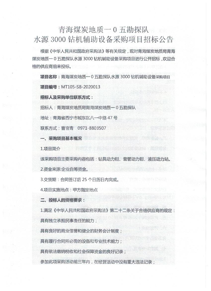 青海煤炭地质一0五勘探队水源3000钻机辅助设备采购项目招标公告