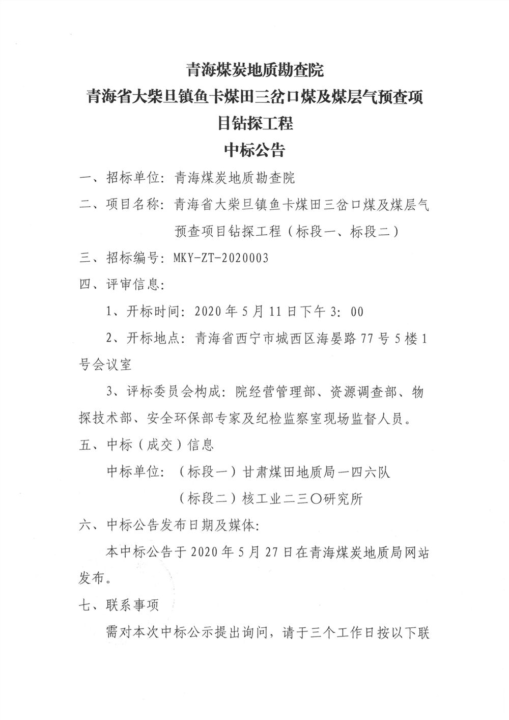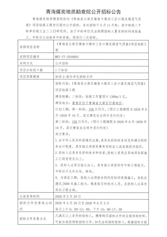 青海煤炭地质勘查院《青海省大柴旦鱼卡三岔口煤及煤层气预查项目钻探工程》中标公告