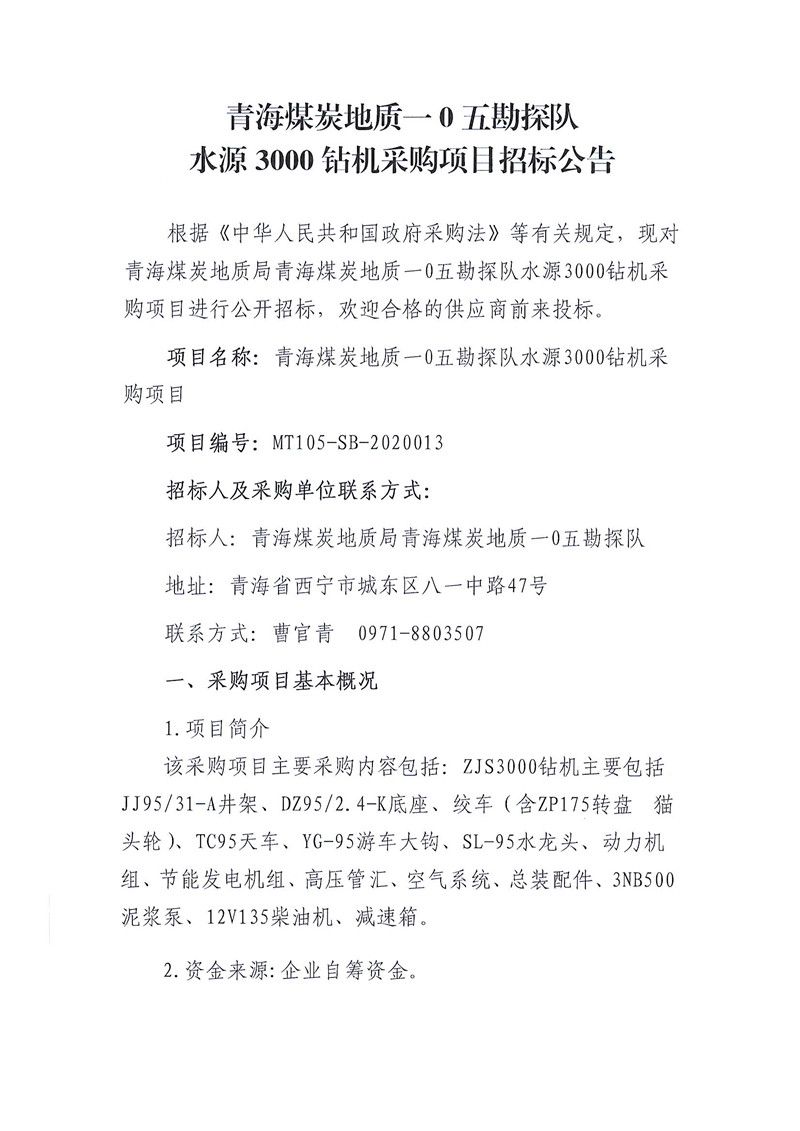 青海煤炭地质一0五勘探队水源3000钻机采购项目招标公告