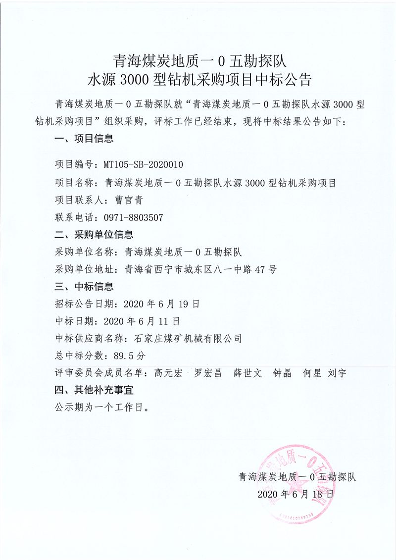 青海煤炭地质一0五勘探队水源3000型钻机采购项目中标公告