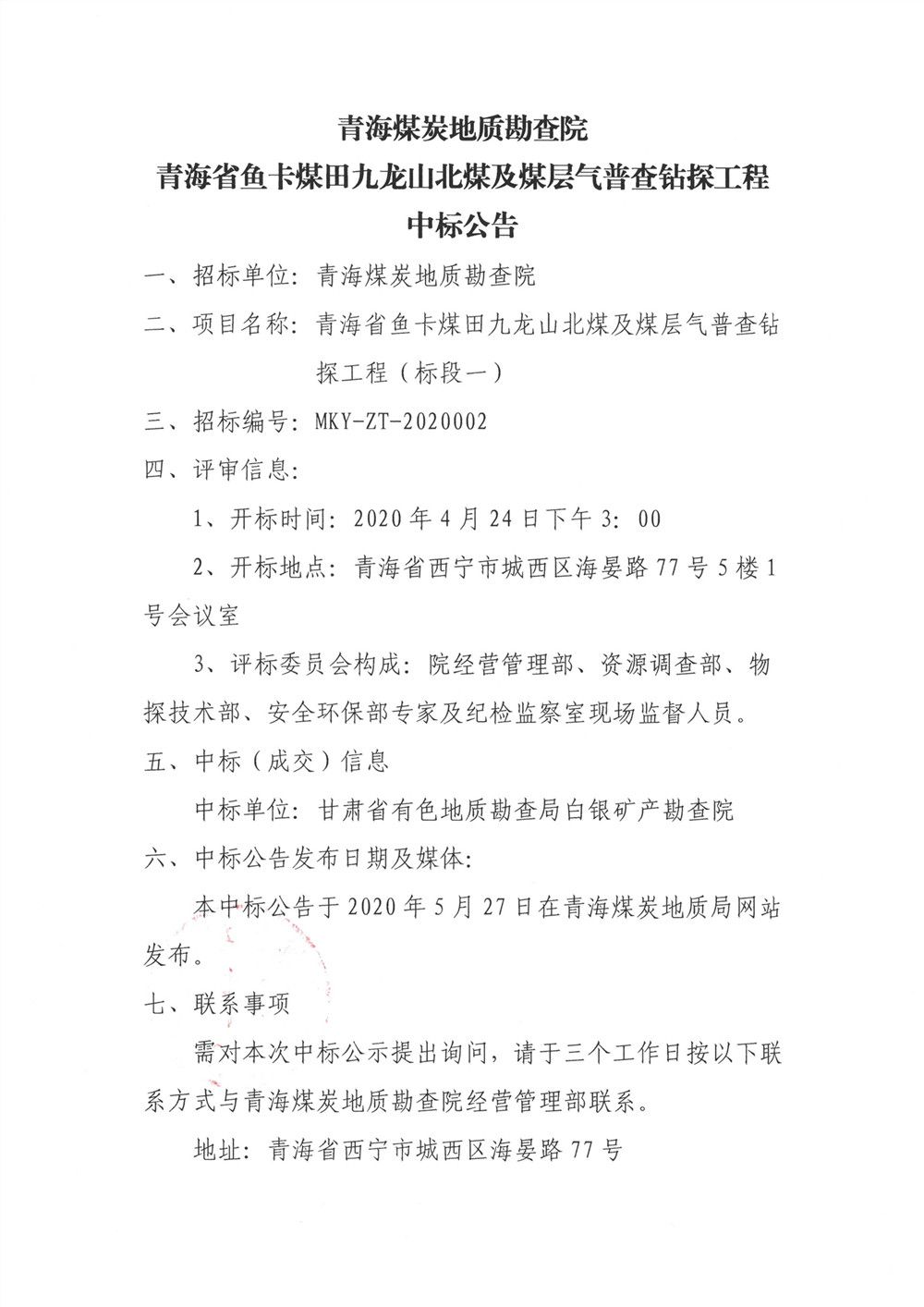 青海煤炭地质勘查院《青海省鱼卡煤田九龙山北煤及煤层气普查钻探工程》中标公告