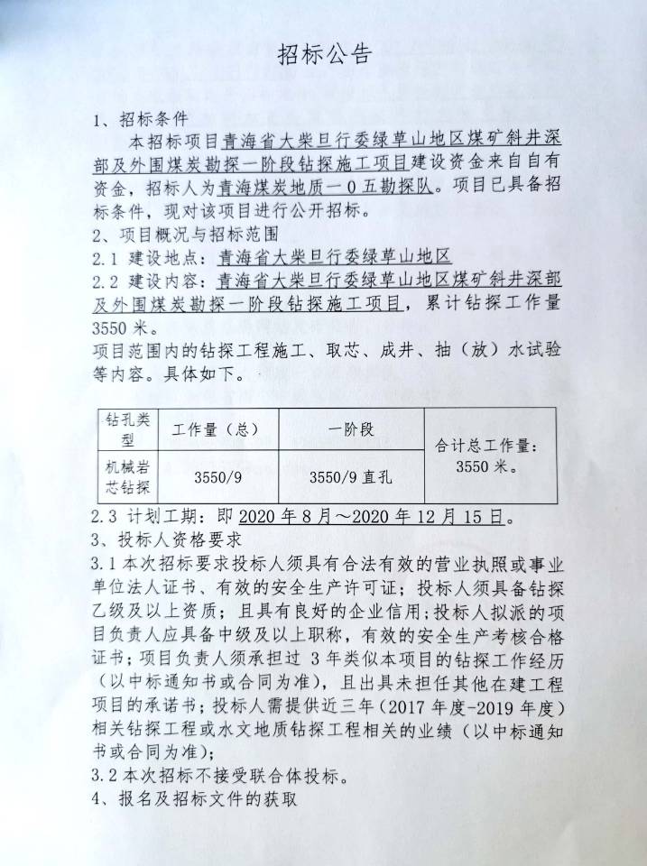 《青海省大柴旦行委绿草山地区煤矿斜井深部及外围煤炭勘探一阶段钻探施工项目》招标公告
