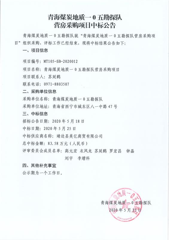 青海煤炭地质一0五勘探队营房采购项目中标公告
