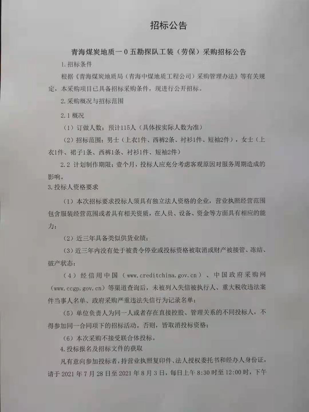 青海煤炭地质105勘探队工装(劳保)采购招标公告