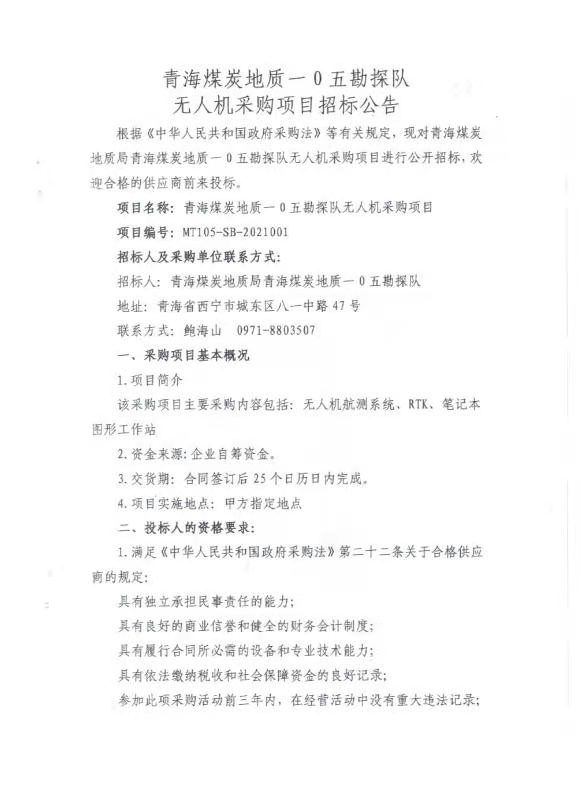 青海煤炭地质一0五勘探队无人机采购项目招标公告