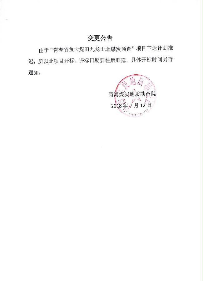 1.招标项目名称:青海省大柴旦行委嗷唠河-羊水河地区煤炭预查项目,2018年钻探工作量1600m/1孔,工期要求:2018年6月-2018年9月底。1.投标文件递交的截止时间(投标截止时间)为2018年5月23日9:00前将投标文件共4套递交至青海煤炭地质勘查院六楼开标会议处。2.工程地点:预查区位于大柴旦行委,距大柴旦镇约60km,G315国道从西南端通过,交通较为方便。2.开标、评标时间为2018年5月23日9:30