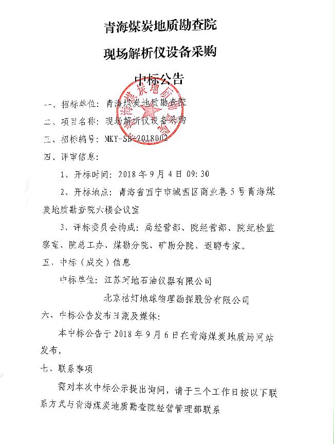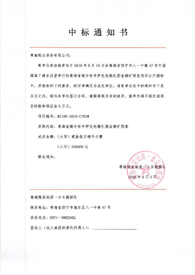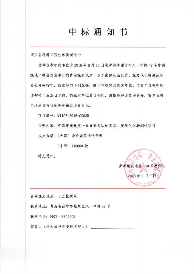 青海煤炭地质一0五勘探队绳索取芯钻具采购 2、招标钻具型号,青海省西宁市城东区八一中路47号 六、招标文件的获取 凡通过资格审查的投标人,投标人资质应具地质钻探生产资质等级乙级以上,七、投标文件的递交 1、投标文件递交的截止时间(投标截止时间)为2018年10 月29日,招标人通过报名材料对投标人进行资格预审。